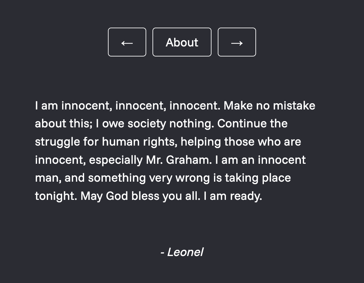 Goodbye Warden is a website where visitors can read through the nearly 600 last statements of death row inmates executed in Texas from 1982-2026. It is a resurrected version of a now-defunct site of the same name that was made and maintained by an anonymous creator from 2014-2021. In clicking through the entries of the deceased - all scraped from Texas’ own database of execution records - users experience one of the rawest confrontations of humanity and politics over and over: the final testimonial of a citizen as they are killed by the state.